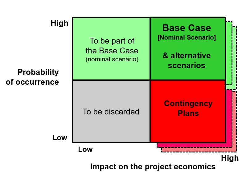 The main scenario presented in your business plan is known as the base case: what you expect to happen when everything goes “according to plan,” with no major errors or incidents. You may also include variants—alternative scenarios or contingency plans—to reassure potential investors of your ability to adapt and rebound in response to social, cultural, economic, political, technological, environmental, or legal disruptions. These different types of plans and scenarios, analyzed through the lens of the impact and frequency of such disruptions, can be represented as follows: