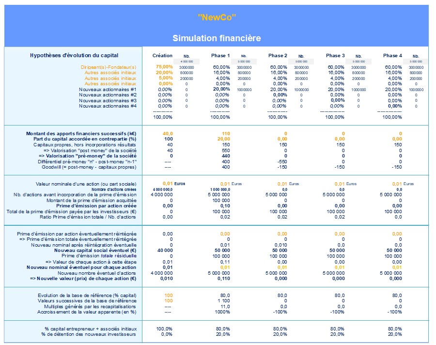 « IngeFi Premium » est un outil d’ingénierie financière qui permet de modéliser et calculer l’impact d’une augmentation de capital en fonction des conditions financières de l’opération projetée : apports financiers et pourcentage octroyé en contrepartie. Vous pourrez ainsi tester plusieurs hypothèses de valorisation de votre entreprise et de dilution des actionnaires existants.
