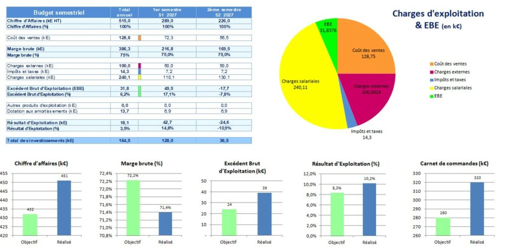 « BizCockpit Premium » vous permet de résumer la situation financière et les perspectives commerciales de votre entreprise grâce à quelques indicateurs clés. Cet outil analyse les écarts entre vos objectifs et vos réalisations effectives, de manière mensuelle, trimestrielle, semestrielle et annuelle. Outre la comparaison entre vos prévisions budgétaires et vos réalisations effectives, quatre grandes dimensions sont analysées : Comptabilité/Finance ; Marketing/Vente ; Ressources Humaines ; R&D/Production/Qualité.