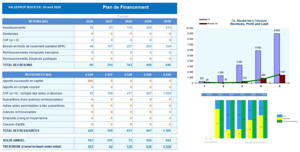 BizPrev Ultimum vous permet à la fois de traduire et de tester rapidement les principales hypothèses économiques et financières de votre plan de développement. Ces hypothèses aboutissent à un compte de résultats prévisionnels, un plan de financement, un bilan prévisionnel, des prévisions de trésorerie, des graphiques et une synthèse comprenant une sélection de ratios économiques et financiers. L’outil comprend également un lexique comptable et financier.